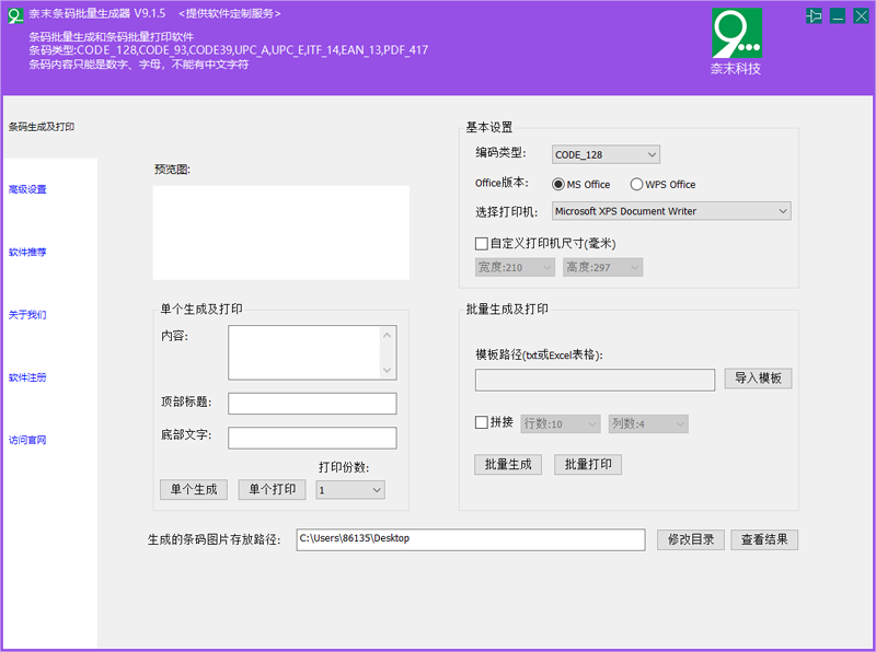 主要功能:条形码批量生成和条形码批量打印,支持Code128、Code93、Code39、UPC_A、UPC_E、ITF、EAN_13、EAN_8、PDF417等条码格式,支持导入Txt和Excel模板批量生成和打印
